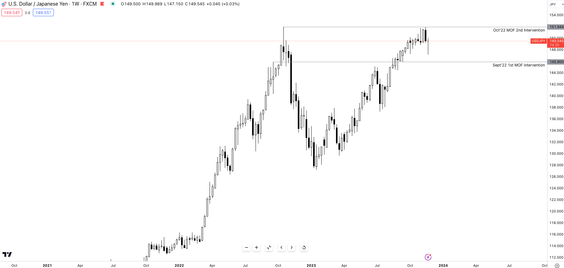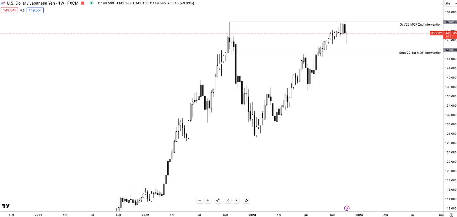 The weakening of the Japanese Yen is of no surprise to all of you reading. Widening yield differential vs G10 currencies + a super accommodative BOJ monetary policy outlook resulted in a rally through 2022 which resulted in two separate interventions by the MOF.
