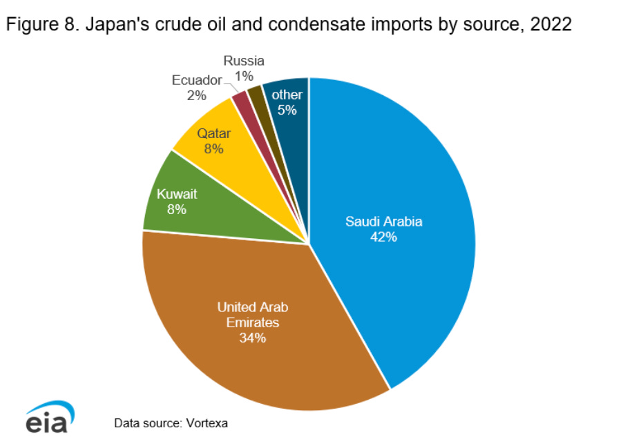 On the commodity side, Japan’s economy is dependent on imports for 94% of its primary energy supply, with over 80% of that coming from the Middle East alone.