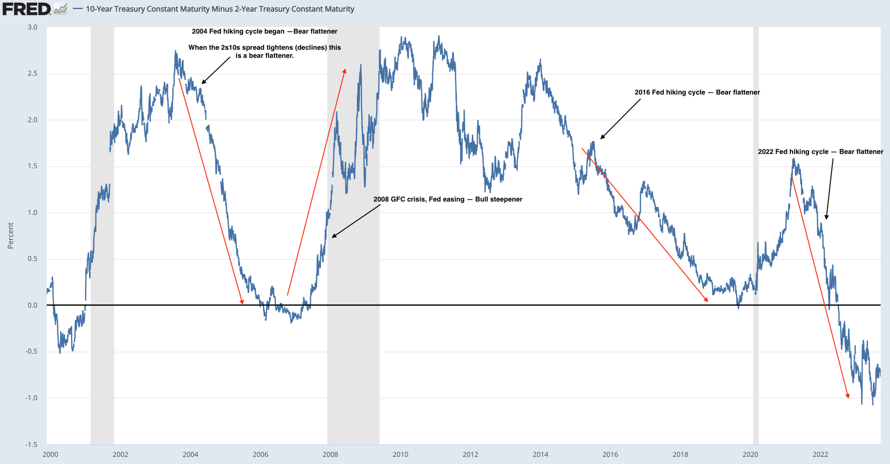 The shift in the treasury curve can be explained through this chart right here, the 2s10s curve. This is the spread between both bond instruments. When the 2s10s curve flattens or inverts this is called a bear flattener. Something I explained here.