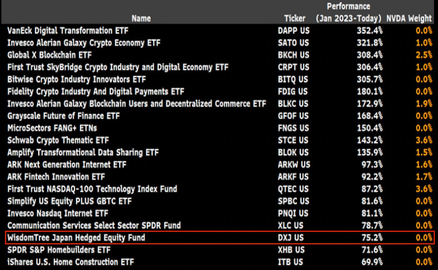 Mostly crypto-themed ETFs and a few fintech ones, but notice our Japan hedged equity index there— the power of (1) understanding currency risks & future central bank policy of G4 economies and (2) gaining exposure to such regions whilst hedging your currency risks ultimately profiting even if the domestic index underperforms.