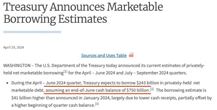 Earlier in April the Treasury released its quarterly refunding announcement, and most notably disclosed that borrowing for Q2 would be $41 billion higher than previously announced. The Treasury Department also stated that they expect to assume an end-of-June cash balance (TGA) of $750 billion.
