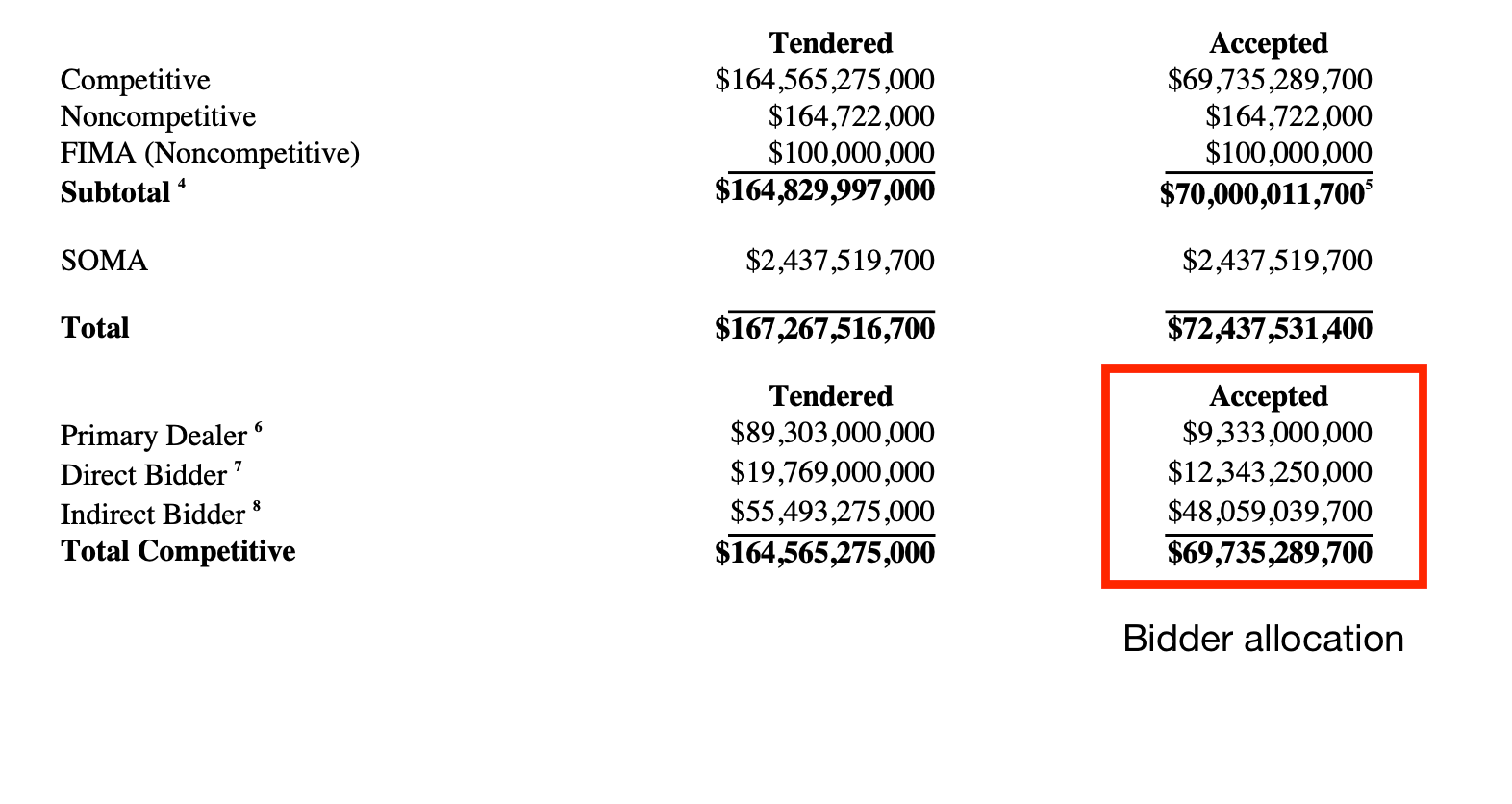 Your competitive bidders are compromised mainly of your dealers. In the US there are 24 primary dealers, the typical names you would expect, GS, JPM, Nomura, Wells Fargo, Morgan Stanley, Citigroup etc. These guys are required to bid in auctions. These primary dealers select a yield they want to purchase the security being issued at, and if the Treasury reviews the bid and is willing to accept their offer only then is the competitive bid accepted. That is why the total competitive bid is $164 billion but only $69 billion was accepted.