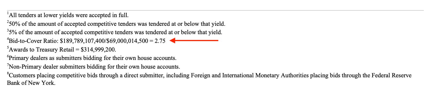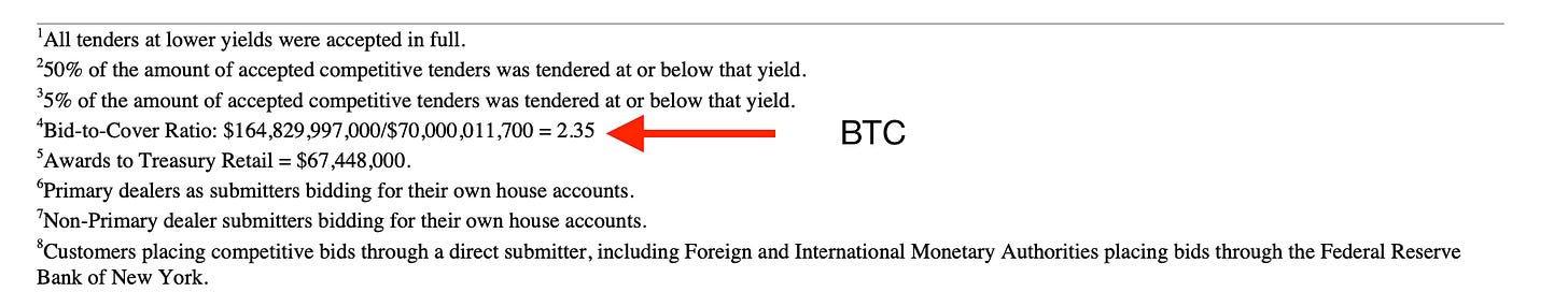 At the bottom of the treasury auction results, you will always find the BTC in the footnotes. Here, for the $70 billion 5Y auction on Wednesday the 26th, the BTC was 2.35, meaning, for every $1 of security ready to be auctioned there was $2.35 in bids. That sounds great, right? Solid demand for an auction—not quite, you see the cover (bids) can be manipulated or inflated by dealers submitting bids significantly below the expected auction price of the bond, which would make it seem as if there was a lot of demand for the bond but in reality the dealers know very well the treasury will not accept such low bids for the securities. They do this to ensure the BTC looks healthy.