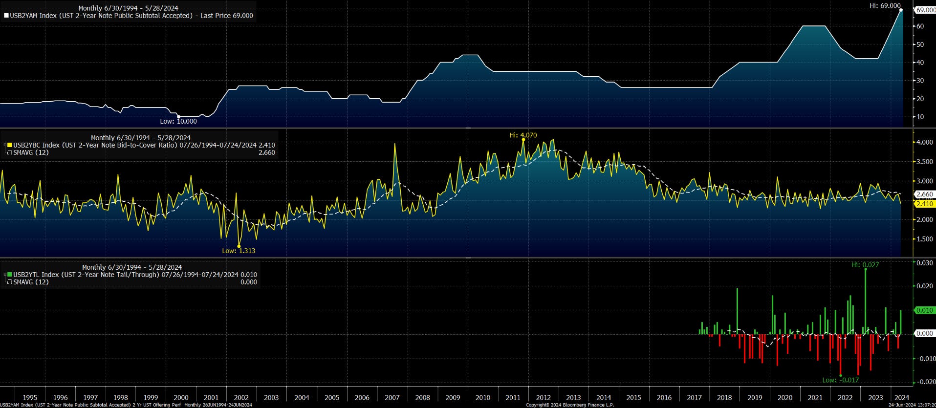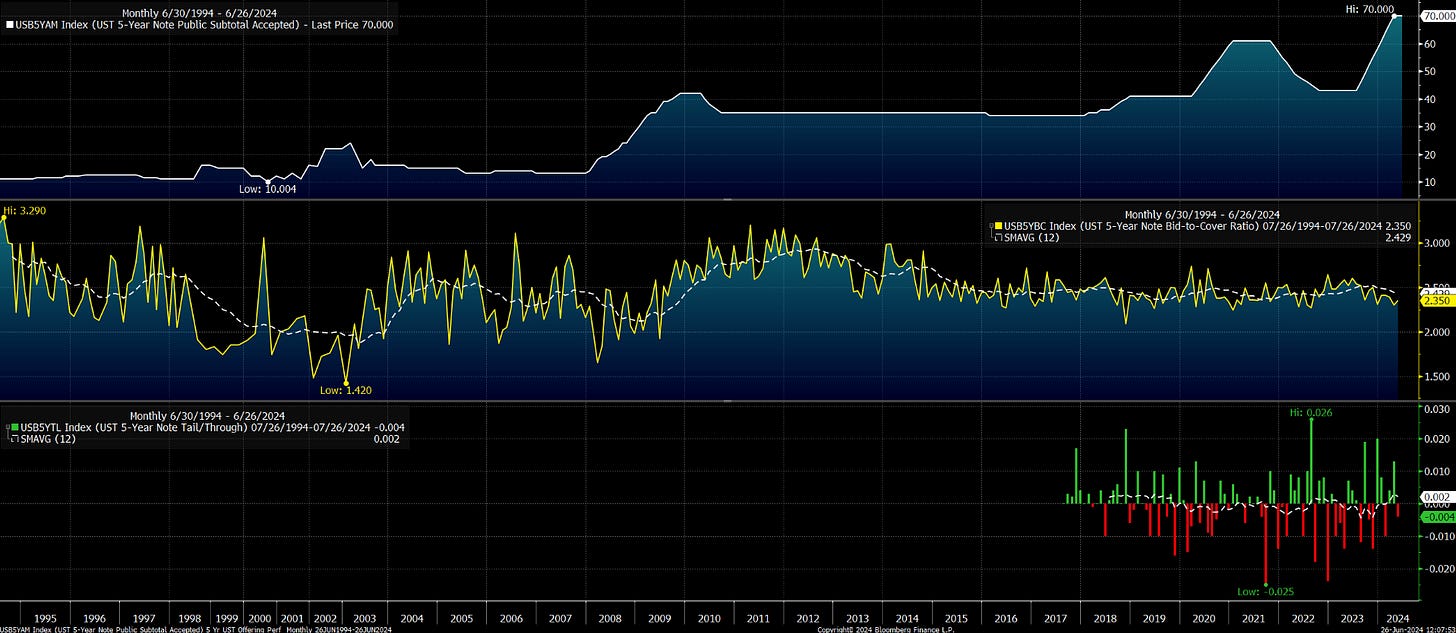 Let’s take the 5Y bond auction from Wednesday, the top chart above shows the monthly accepted bids for the 5Y treasury note in billions of dollars from June ‘94 to June ‘24. The most recent record was a high of $70 billion this past Wednesday.