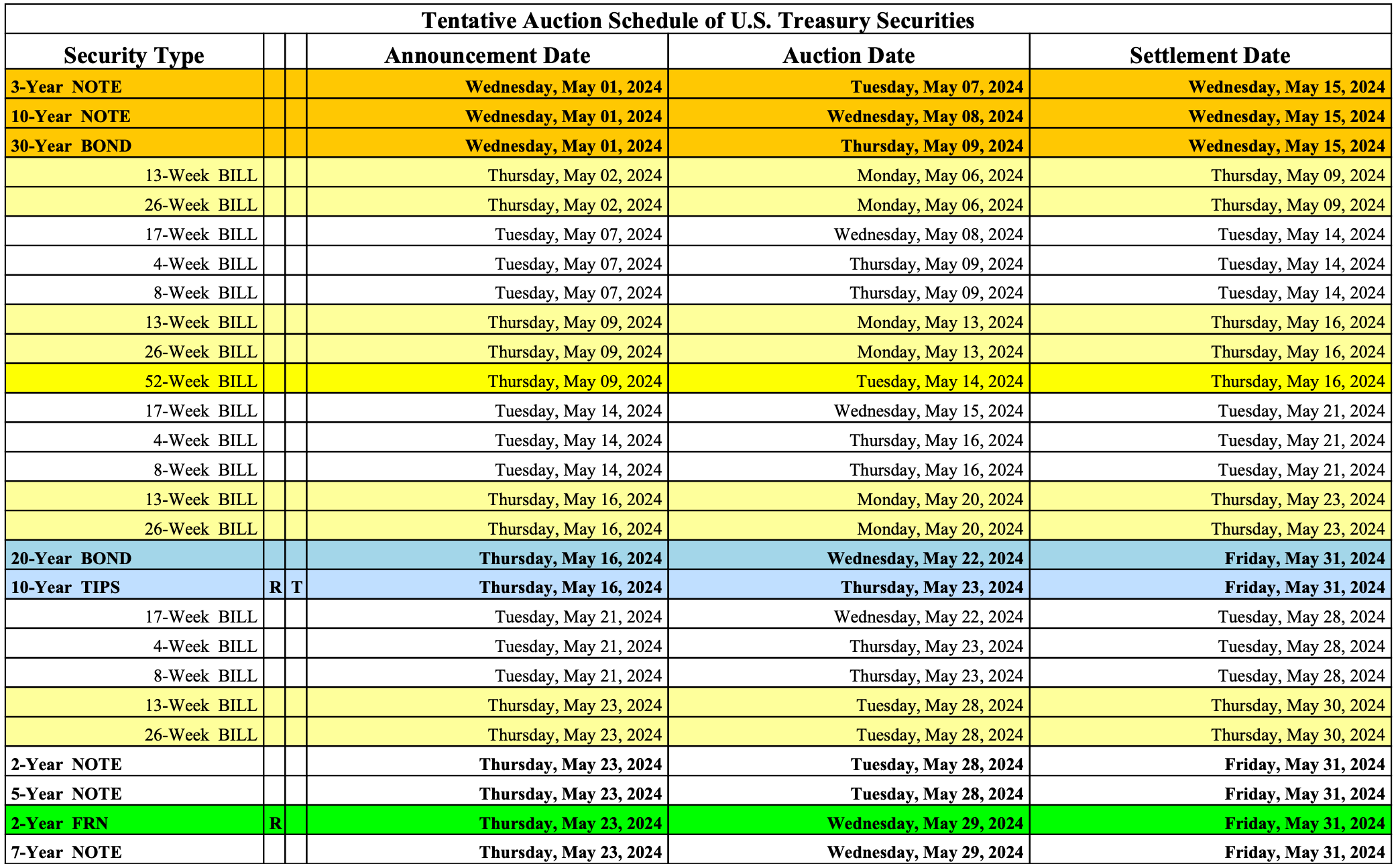 This is the schedule of the Treasury auctions through to October 24th ‘24. Treasury auctions are done in a Dutch auction format, meaning, participants submit a yield in which they’re willing to purchase a certain amount of treasuries being auctioned. The Treasury reviews the bids and figures out the highest yield they need to sell the securities at to fill the auction. The Treasury awards the security to the highest bidders (lowest yield), up to the offering amount.