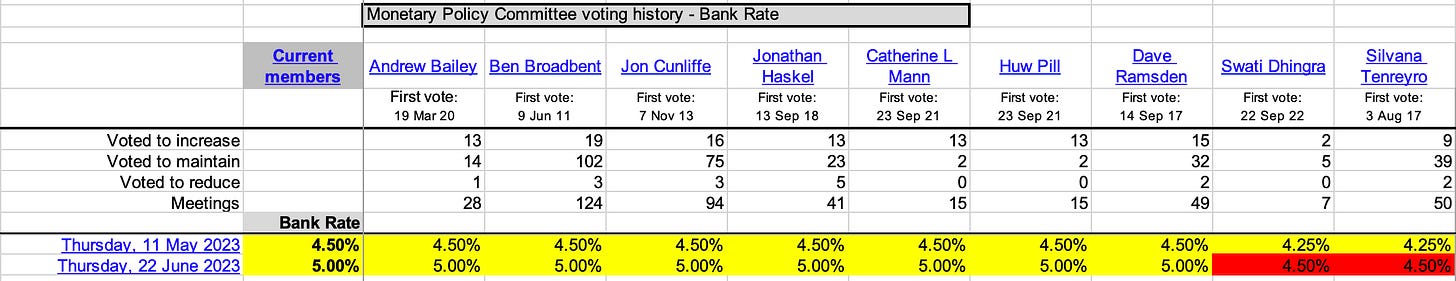 The BoE was expected to advance rates to 4.75%, but after the hot CPI print I was convinced that 50bps would be the appropriate reaction, and it seems the MPC too were also convinced. Below you can see my Excel sheet showing which members within the BOE voted for rate increases or pauses.