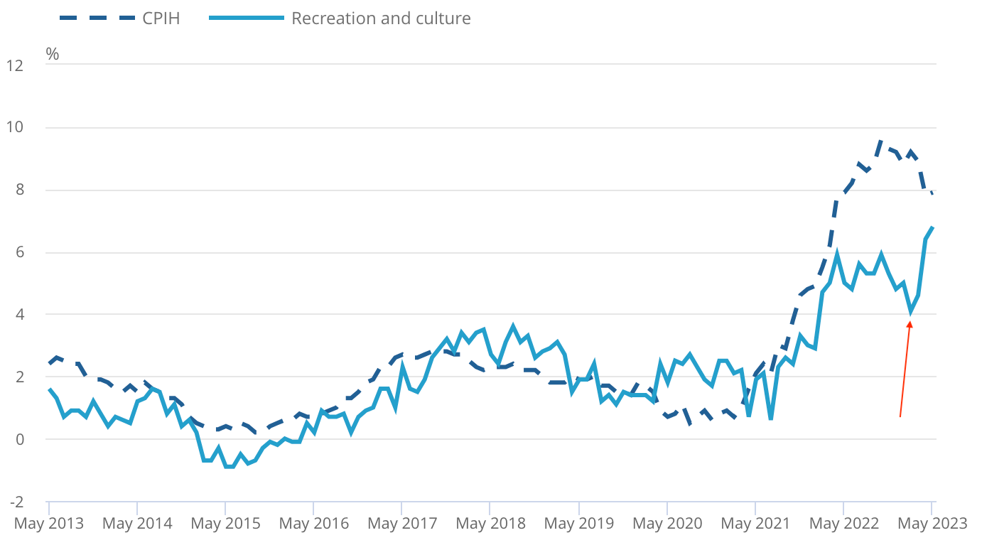 February 2023 marked the trough in annual inflation for recreation and culture in 12 months, but from March to April we saw a huge rebound in consumer spending in this particular component.