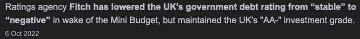 Well, since the removal of our beloved Kwasi Kwarteng, you can see the bond market has been in favour of Jeremy Hunt. Lower yields are generally associated with lower-risk investments, as opposed to bonds of high yields, commonly known as junk bonds/non-investment grade. A brief reminder that fiscal policy changes can have drastic effects and influence on domestic markets; after the mini-budget, you may recall one of the globally renowned rating agencies Fitch lowered Uk’s bond rating: