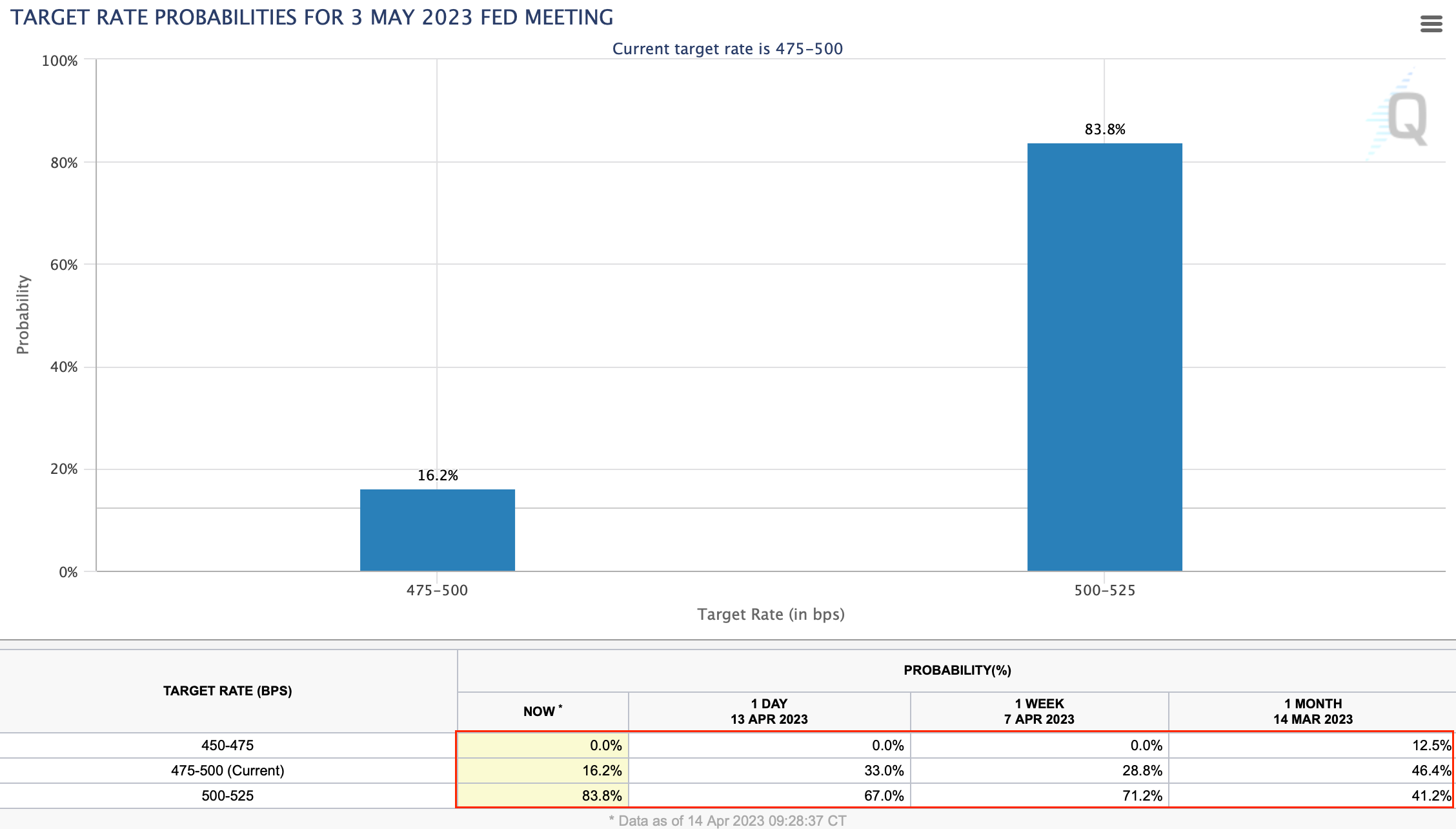 Rate of change. Probably the most important thing when analysing the macro environment, developments and changes in financial conditions. The series of events this past quarter were historical, and you can see how that has played into target rates probabilities for the Fed. March 10th, SVB collapses and triggers a number of other bank failures within the U.S that same week. Now look at the figure, 1 Month 14th March, expectations of a Fed pivot, aka the Fed cutting rates were 12.5%, with the majority of expectations shifting towards a Fed pause. You can see over a period of 4 weeks markets have done a 180, ruling out the slightest chance of a Fed cut at the upcoming May meeting and now fully backing a 25bps hike.