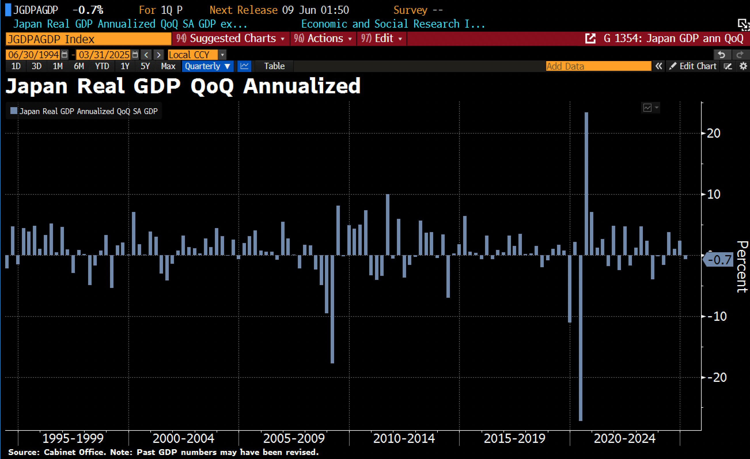 Japan’s economy contracted for the first time in a year, underscoring its underlying fragility, even before the full impact of Trump’s tariffs is felt. Inflation-adjusted GDP fell by an annualised 0.7% in the first quarter, a sharper decline than forecasts, with expectations set at just a 0.3% drop.