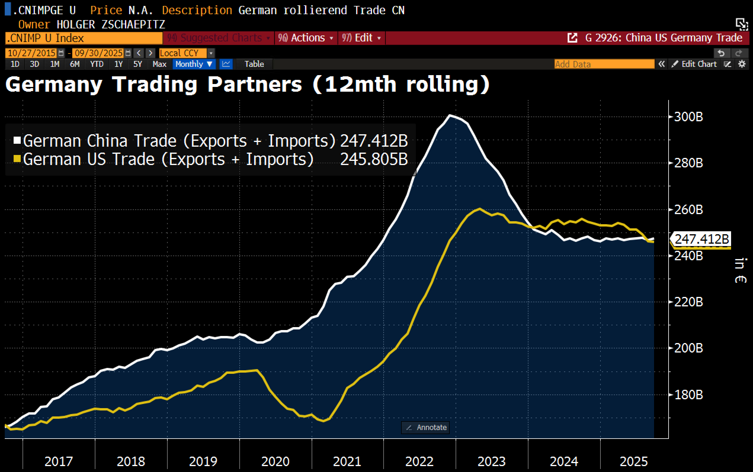 China is becoming an even bigger trading partner. Over the past twelve months, trade with China totaled €247.4bn, nudging ahead of the €245.8bn in trade with the U.S. The issue is that trade with the U.S. supports German growth because Germany runs a surplus there, while trade with China weighs on growth because Germany runs a large deficit. That deficit with China has now widened to almost €78bn over the past year.