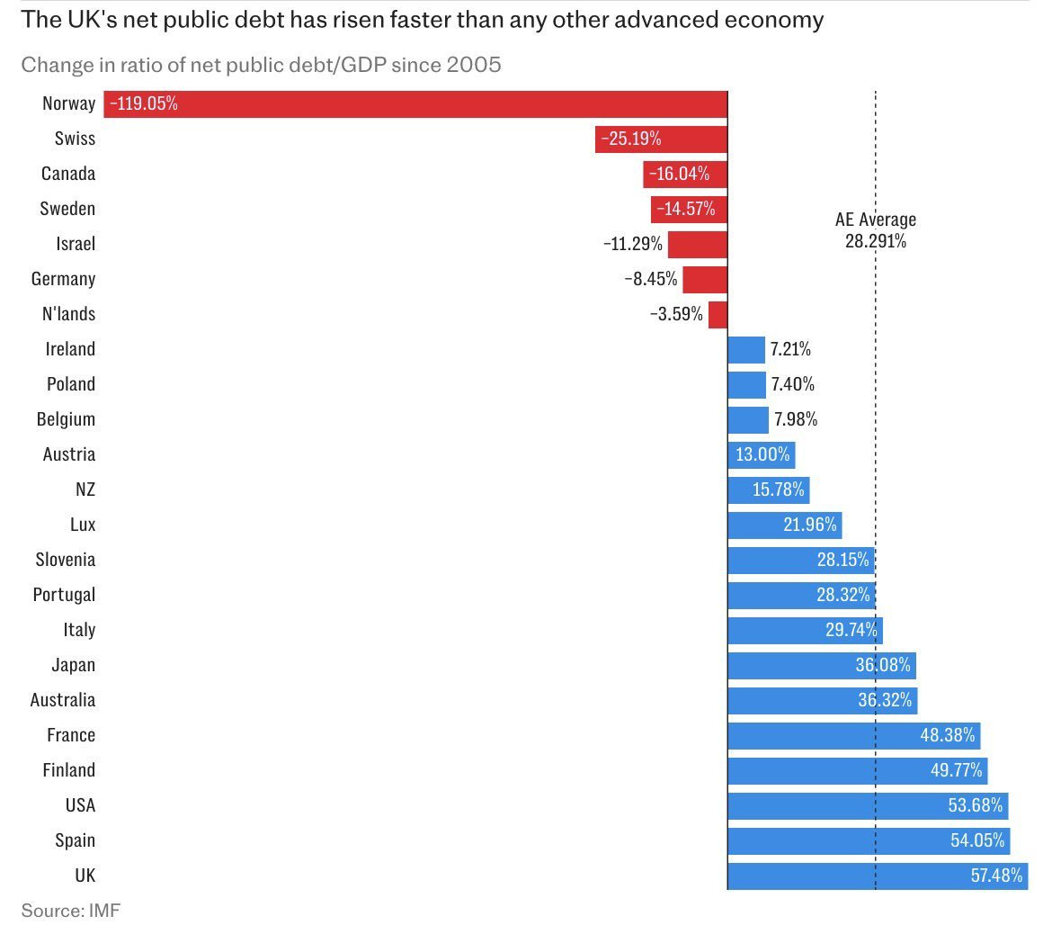 The UK’s debt ratio has surged more than any major economy, far above the advanced economy average, which shows how weak productivity and fiscal drift have piled up through multiple crises. It leaves the next policy cycle boxed in, with growth demands smashing into already exhausted fiscal space.