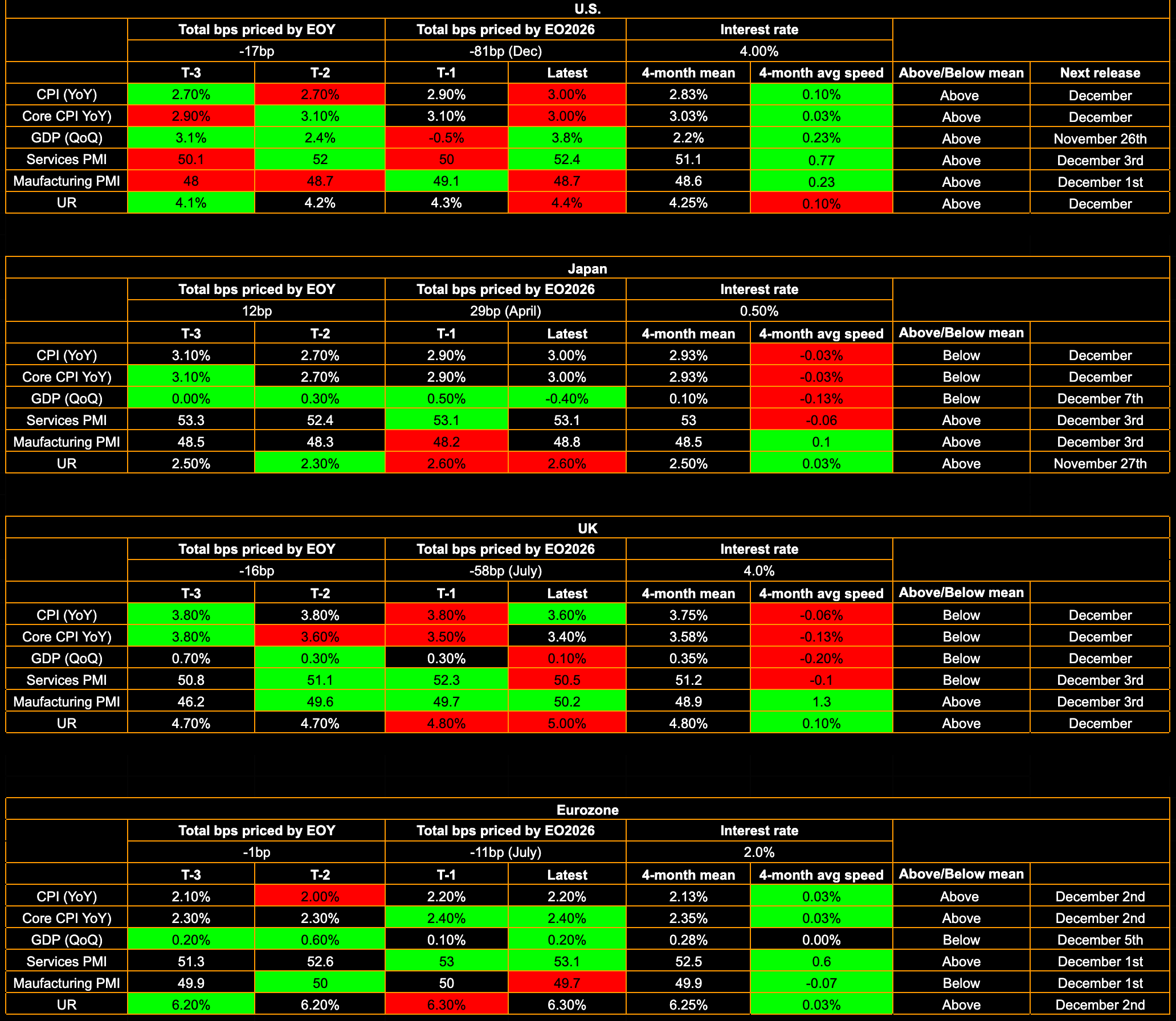 This week in the U.S., my eyes are glued to the big September readings on PCE, retail sales control and PPI… even though weekly jobless claims still matter. I’m watching how these releases actually hit the OIS curve, which is currently pricing about 17bp for the cut in December meeting. That one is worth paying attention to because the recent shift in equity positioning and the unwind we’ve seen basically came from the Fed taking a relatively more hawkish tone compared to previous speeches and meetings.