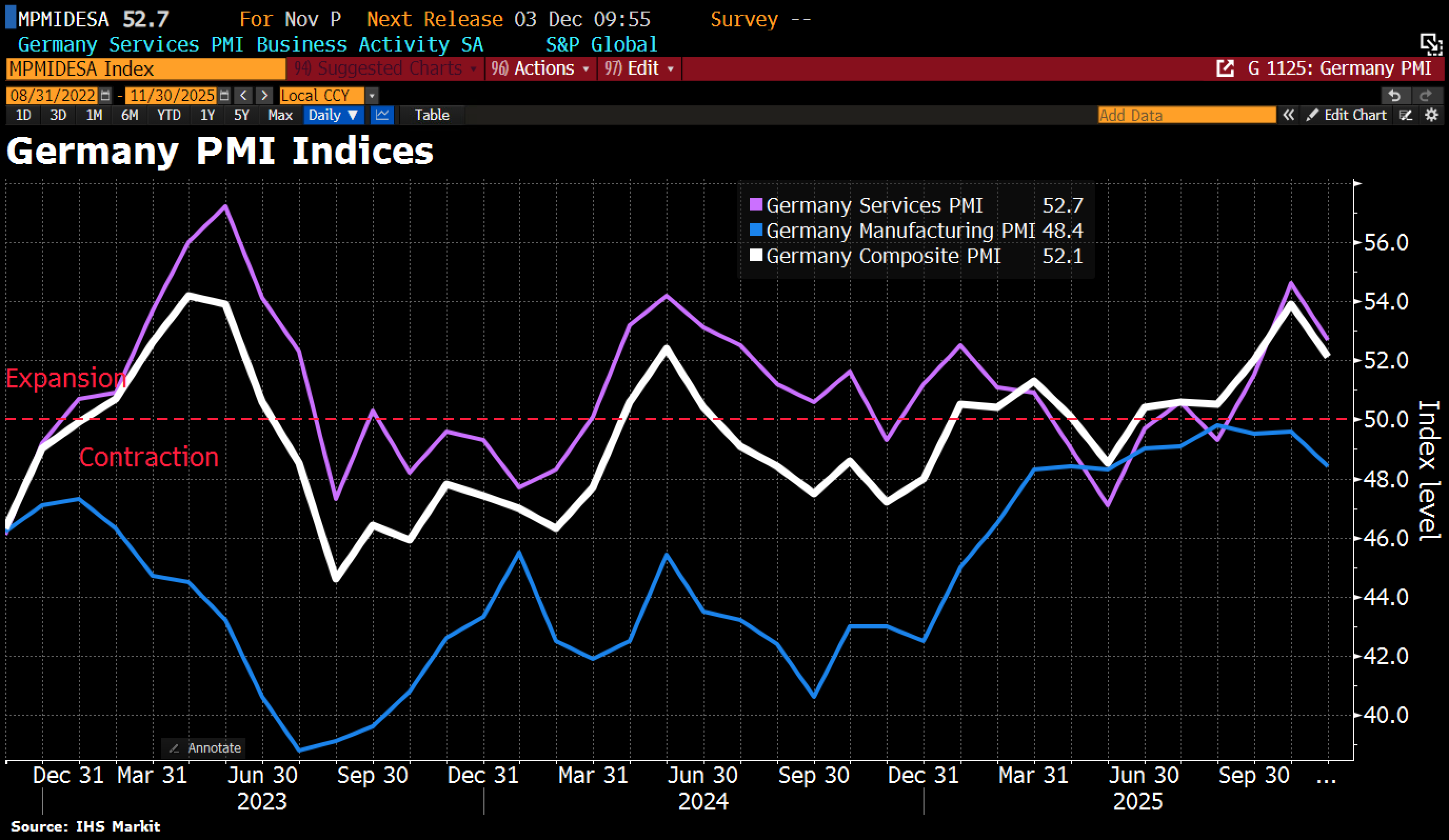 Business activity also slowed in Germany in November. The Composite PMI slipped to 52.1 from 53.9 in October, basically signalling that the German economy is barely growing and may only manage marginal expansion in Q4. Manufacturing is still the main drag, with the Manufacturing PMI dropping to 48.4 as U.S. tariffs and rising competition from China weigh on output.