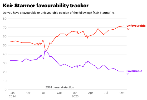 Now the UK. The big spotlight is on Wednesday’s budget. Labour has been under a cloud, ratings across the board have been pretty depressing and honestly that’s not surprising given how often their stance seems to change. They came in promising no tax hikes for working people and even pledged to cap corporation tax at 25%. But Rachel Reeves wouldn’t rule out hikes to things like capital gains tax, inheritance tax or changing thresholds instead of rates, meaning people get pushed into higher brackets as wages rise. No shock that the chart below looks like it does.