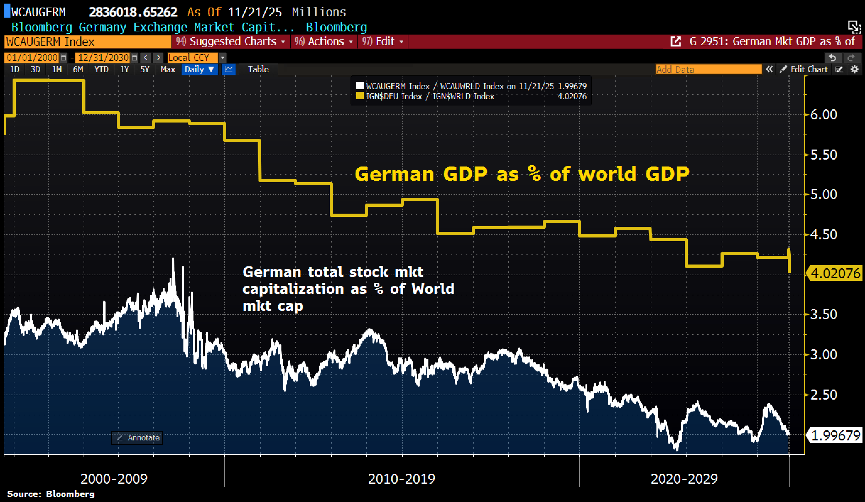 Things aren’t great for the main eurozone equity market either because Germany is losing influence on the global stage. Its share of world GDP has dropped to 4.3% and is projected to fall to 4% by the end of the decade. Germany’s footprint in global markets is shrinking too, with the market value of German stocks falling below 2 percent of global market cap again.