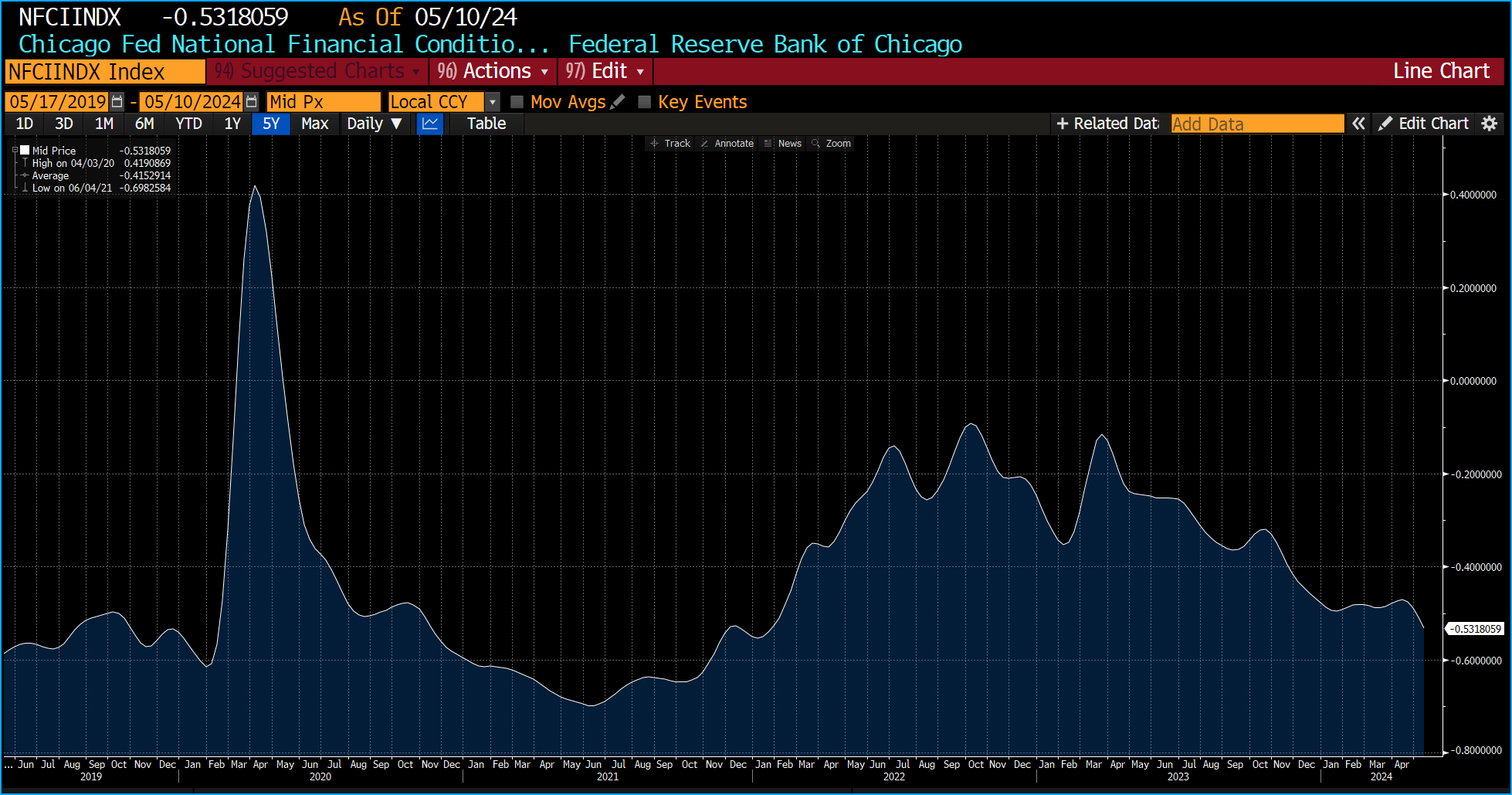 This means two things, the markets liquidity is the same now as it was when global rates were at their lowest and also the negative figure of -0.5 shows that the overall financial environment is accommodative, with credit being more accessible and cheaper than historical average.