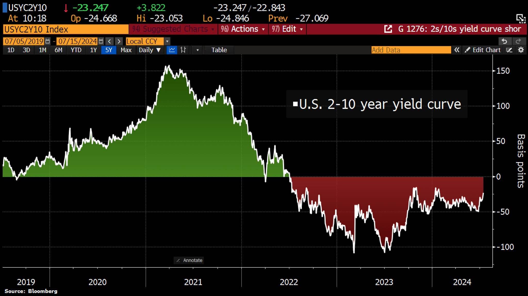 Another great gauge of global liquidity is the bond market, especially the US bond market. Bonds are driven by multiple factors ranging from risk sentiment to monetary policy expectations. The 2s10s curve has been inverted since July 2022, typically an inversion means there is economic weakness, a tight economy and a potential recession on the cards.