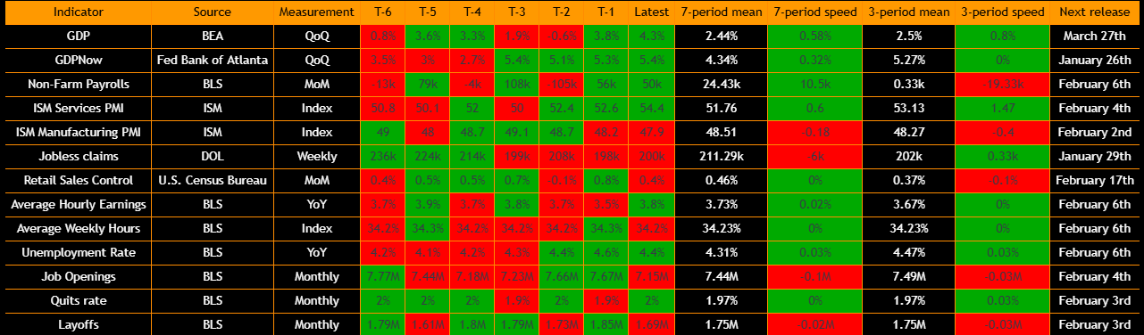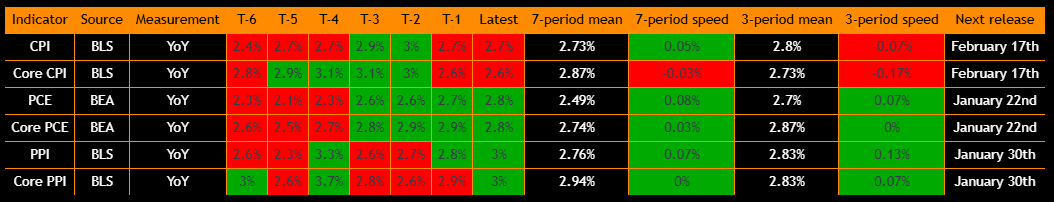 Inflation is the more complicated part of the picture and is pushing us into a reflationary regime (for now). Inflation swaps have been rallying since early January, and most inflation metrics are positive on 3 and 6 month bases. Breakevens and nominal rates have both been moving higher on a Z score basis, which tells you inflation expectations are being repriced up and adding pressure to nominals. At the same time, core and headline CPI are slowing on a 3 month basis but I’m yet to call take this as disinflaitonary pressures. I’m watching the 6m speeds closely as we move into February. If we see 6m metrics shift, I think we could be heading into a goldilocksregime will will create at least another leg higher for equities.