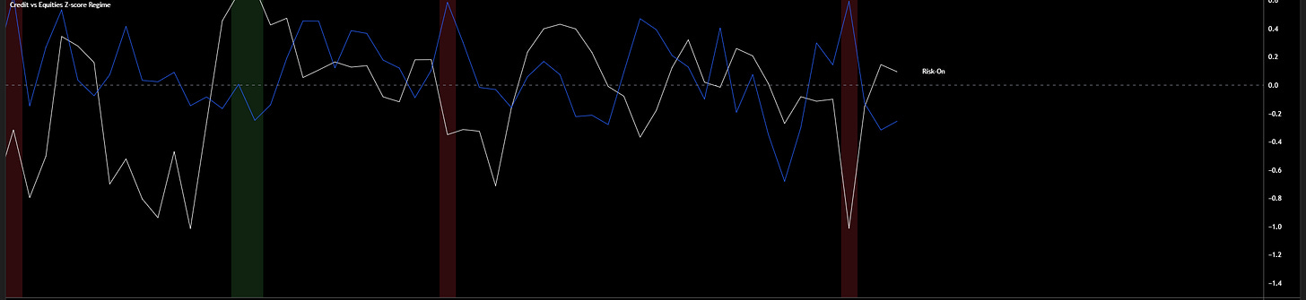 Positioning confirm the relatively easy backdrop. Put skew is moving lower (although we did see it blow out temporarily on Tuesday), implied vol is falling, credit spreads remain tight, and VIX is sitting near neutral levels. Equities are also outperforming credit on a Z score basis (I gave this indicator in the Substack chat), which tells you stress is not building beneath the surface... yet.