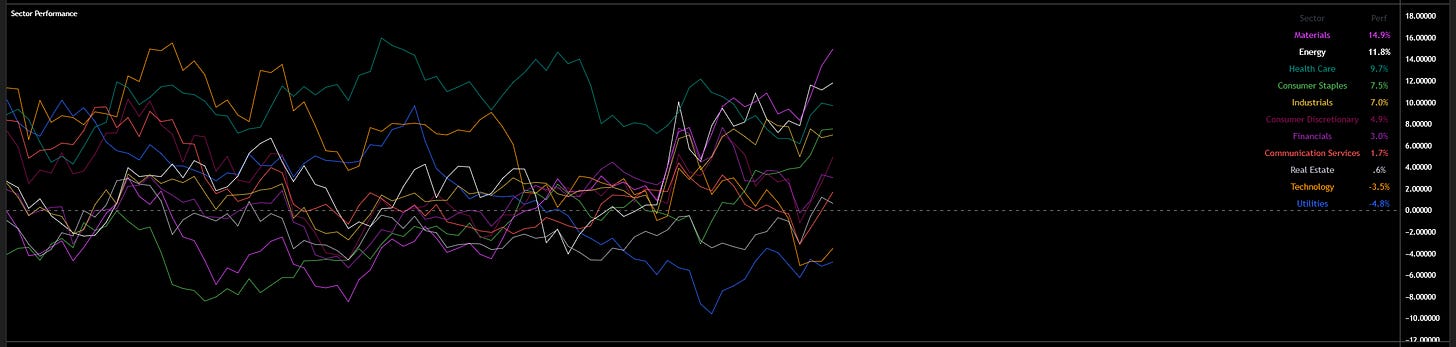 Equity leadership reinforces that positioning is shifting. Energy, materials, staples, and industrials are leading, and factor performance is tilted toward size and value. That kind of rotation tends to show a market that is pricing ongoing nominal activity. Labour market tail risks also look contained. While hiring momentum has slowed a bit, there is no clear signal of a sharp deterioration that would force a sudden repricing of growth expectations. If we start to see industrials and tech move up this ladder on a 3 month lookback, with the curves still steepening then there is less pressure on equities from rotation.