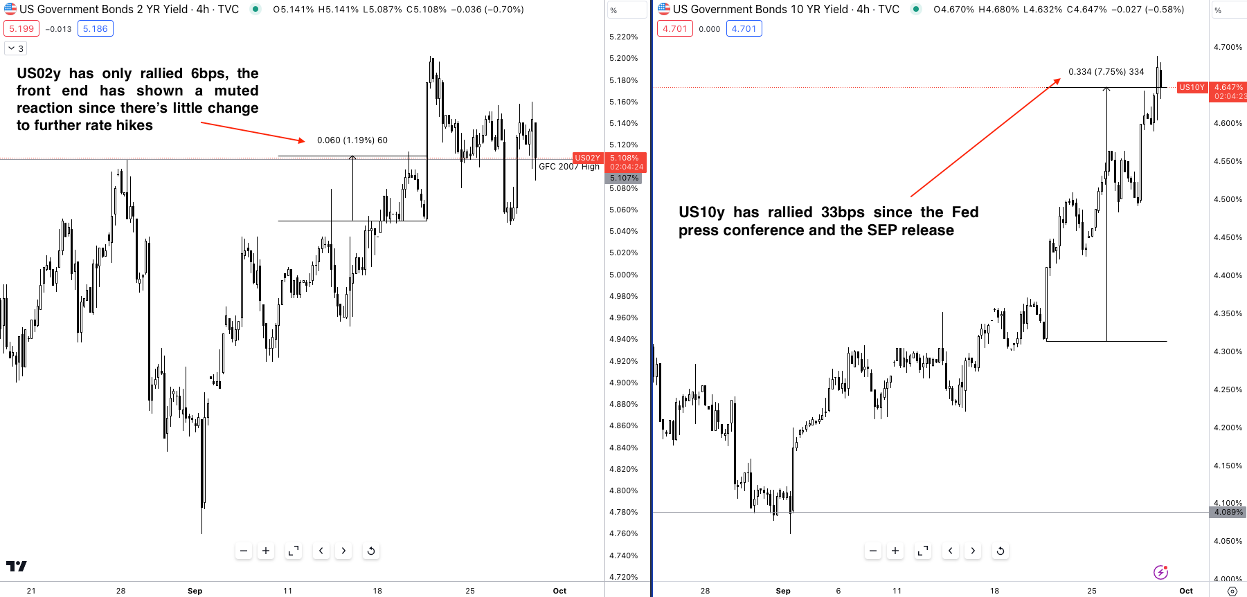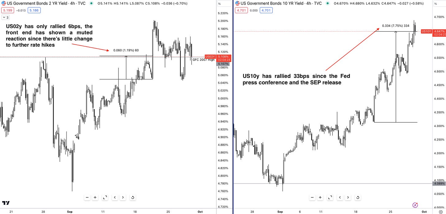That leaves interest rates. Compared to the June SEP projections, a 50bps rate cut has been removed from the rate path in 2025. So it’s pretty clear that the long end of the yield curve is reacting to this 50bps rate cut removal.