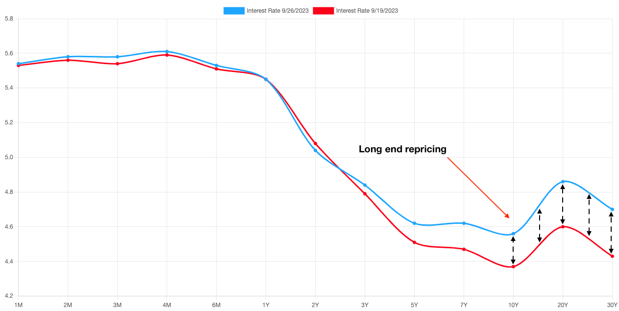 The chart above shows that the 10-year yield has rallied 33 bps since the press conference and SEP release, while the 2-year yield has shifted 6 bps higher. Further, down the curve, the reaction is greater for bonds with higher duration, with the 20-year and 30-year yields both increasing by 40 bps since September 20.
