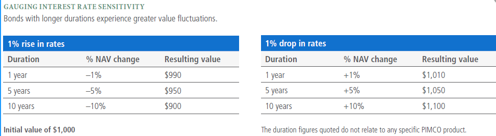 As the example shows, a 1% rise in rates has little effect on the 1-year bond due to its lower duration risk. However, when you hold a 10-year bond, the same 1% increase in rates can cause the value of that bond to trade well below its face value.