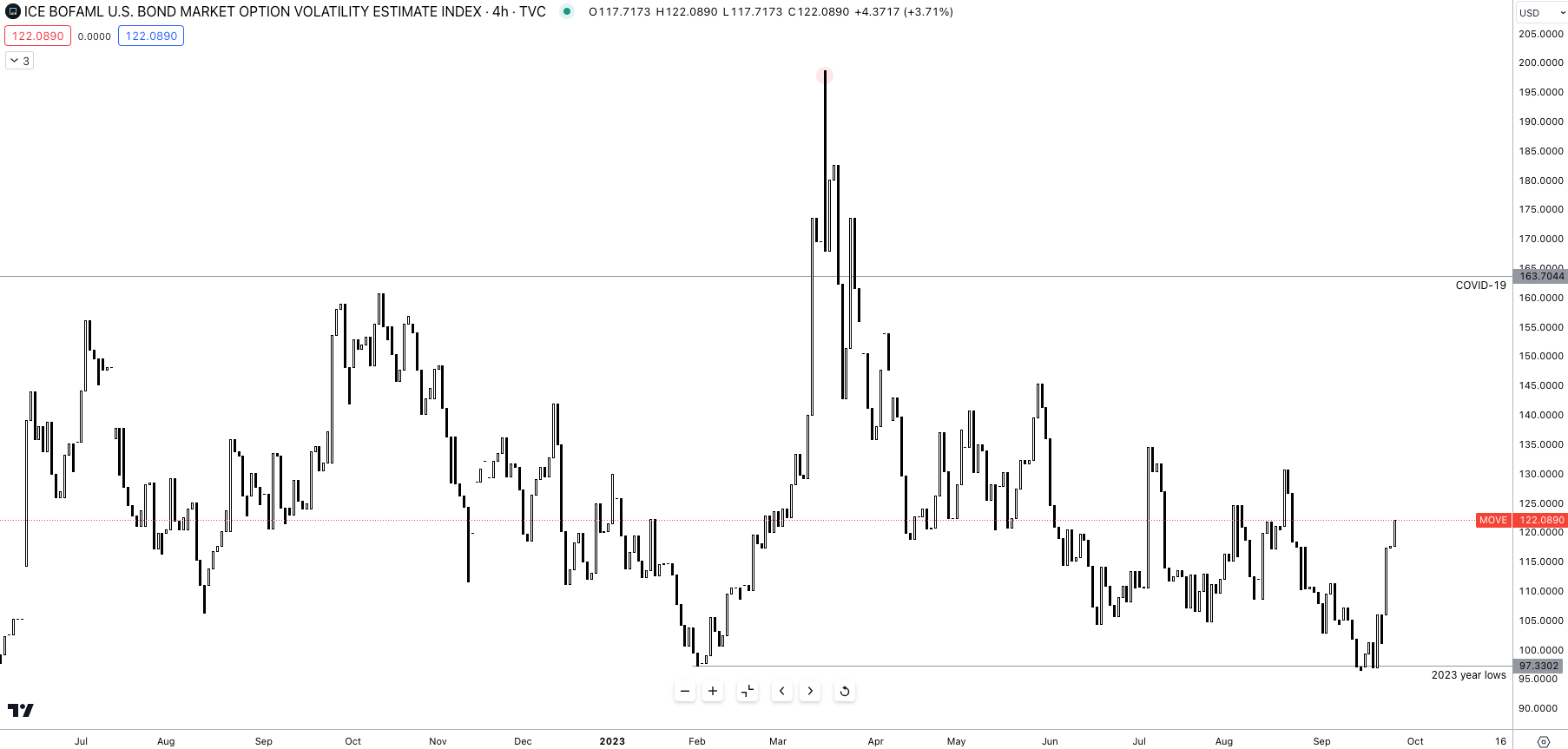 As a benchmark, since inception the average value of the MOVE index is 103.00, as of now the index has just surpassed 122.00 moving towards 130.00. This rebound comes after the index settled near the lows of 2023 before rebounding post the FOMC meeting.